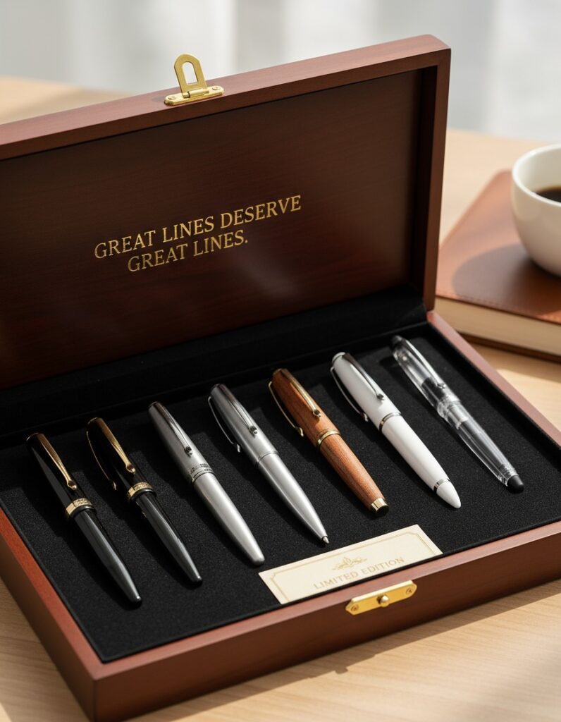 Five smooth-writing pens in a collector’s box—because great lines deserve great lines.